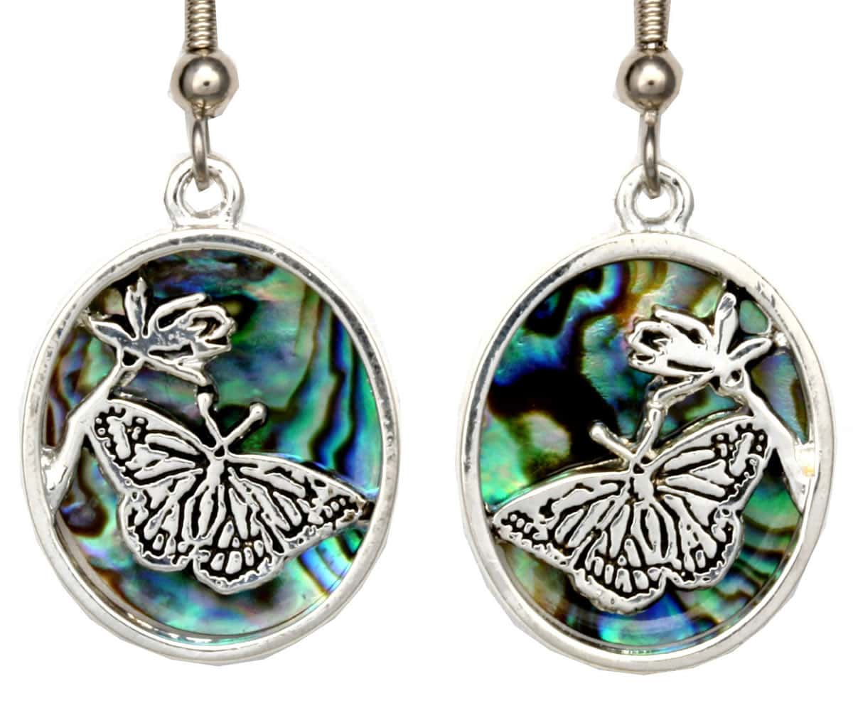 Abalone inlay silver-plated butterfly earrings created in this pretty cut-out butterfly and flower cast design adorned with a shell. Shop fashion abalone butterfly earrings. The quality of the ear wires is very important. We only use surgical steel hypoallergenic ear wires on our earrings as they are the safest ear wires, especially for women who have sensitive skin.