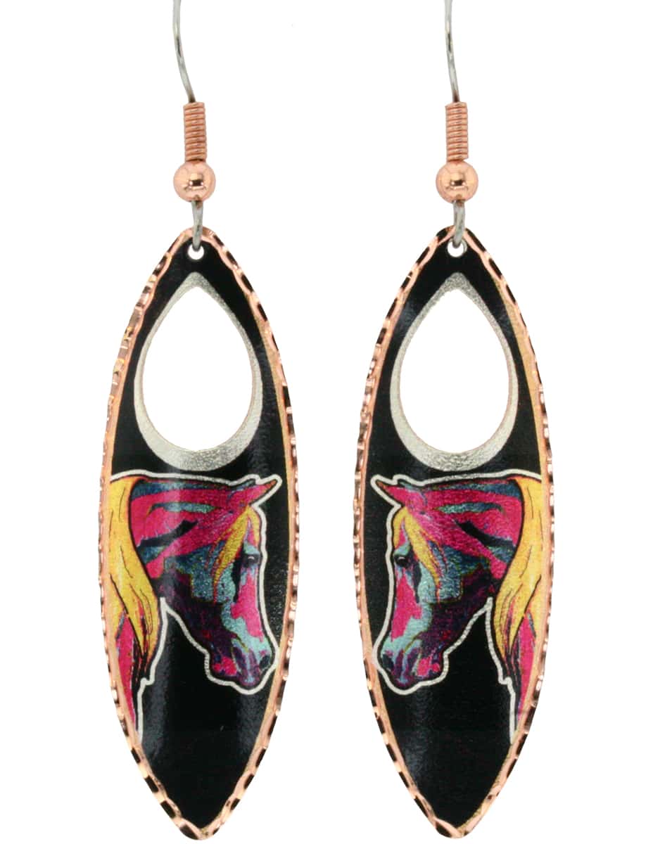 Teardrop colorful horse earrings handmade from copper in stunning whimsical horse artwork with a black background. Buy stylish horse earrings for women who love horses. These feminine & sophisticate cut-out long teardrop horse earrings are 16 mm X 46 mm ( about 0.63 x 1.8 inches ) in size.