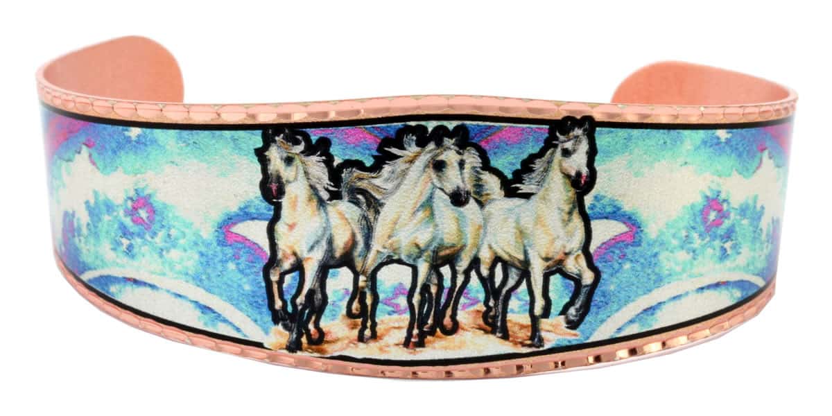 These gorgeous running white horses bracelets with colorful watercolor inspired background are individually handmade, silver plated and diamond cut on copper bracelets to add that special touch to any wardrobe.