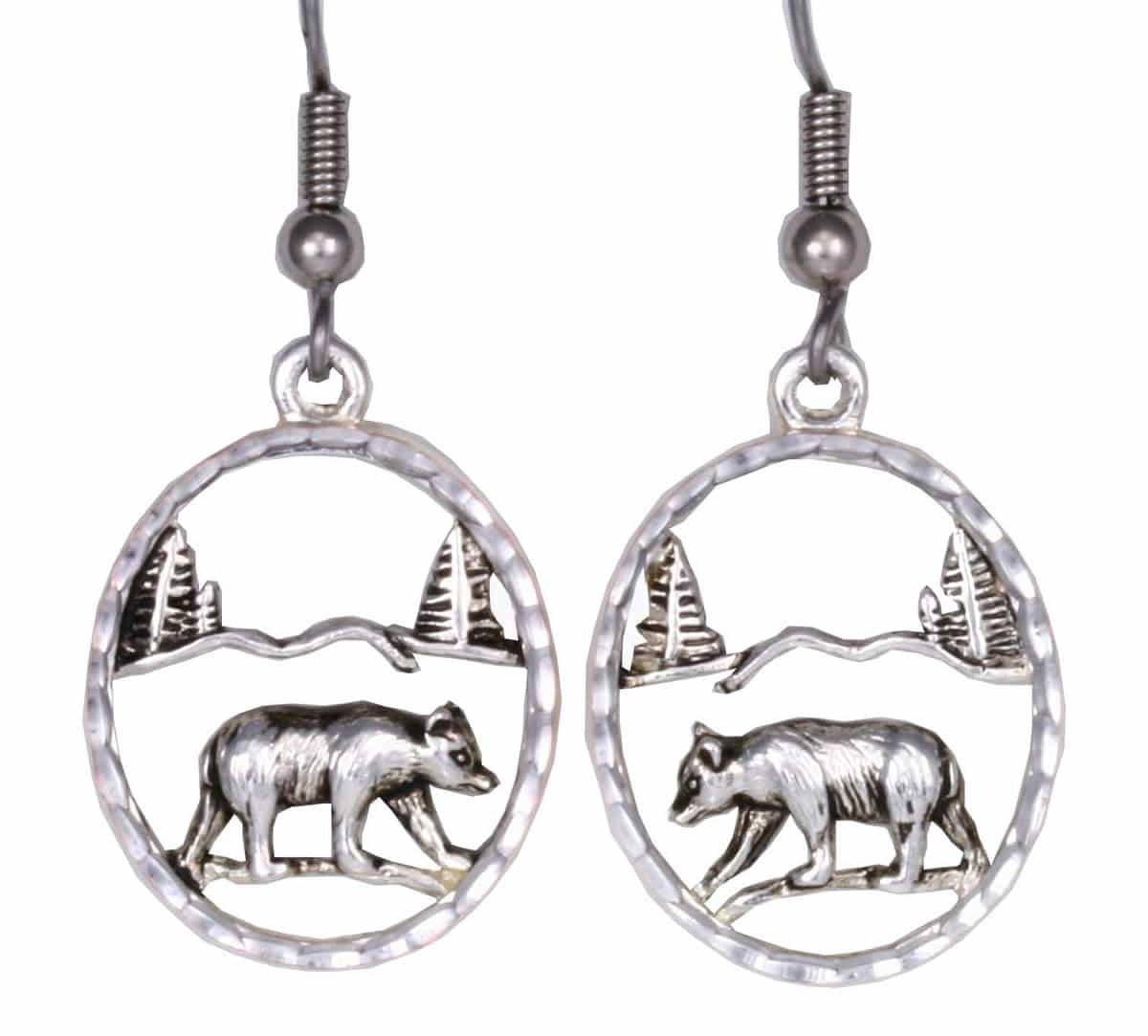 Wholesale fashion earrings are created in cut-out bear and forest design that is antique silver plated and diamond cut in these delightful bear earrings.