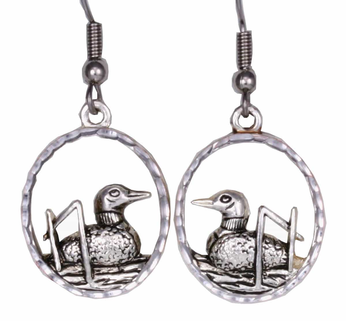 Fashion earrings created in cut-out Canadian wildlife loon design. These distinctive loon earrings are antique silver plated and diamond cut to add extra sparkle to every outfit.