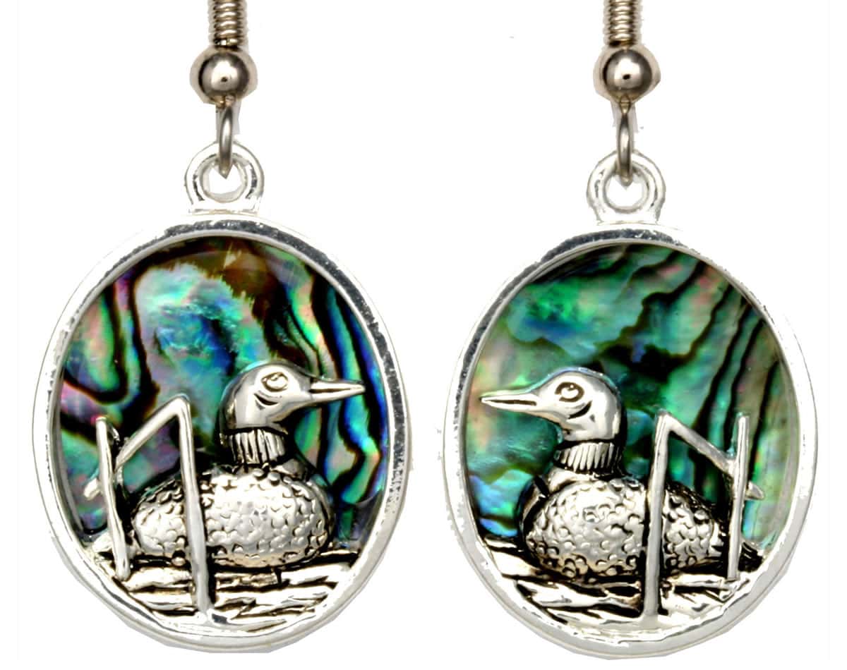 Abalone inlay silver-plated loon earrings created in this pretty cut-out loon on a lake cast design adorned with a shell. Shop fashionable and feminine abalone loon earrings which are subtle but elegant looks that will fit perfectly with all your outfits. The lightweight earrings are always a pleasure to wear without the pain of heavy cast earrings. All our handmade earrings have surgical steel hypoallergenic ear wires so you can enjoy them without any discomfort.