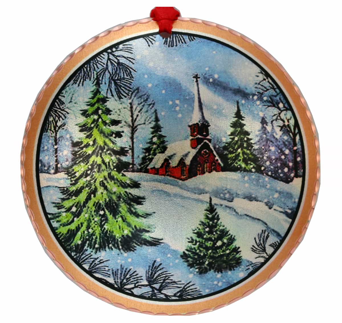 You can almost imagine the snowflakes falling on your face in this beautiful winter church scene. Handcrafted from copper, silver plated and diamond cut these unique handmade Christmas ornaments will make your holidays even more special.