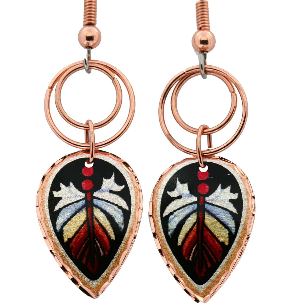 Wire jewelry feather art copper teardrop earrings with dangle copper wires & colorful feather artwork by Lynn Bean. Buy wire copper feather earrings. With their shimmering colors and sparkling diamond cutting these amazing dangle feather art copper earrings will be your favorite and pleasure to wear jewelry. No polishing is required as they are protected from tarnishing with many layers of acrylic finishes.