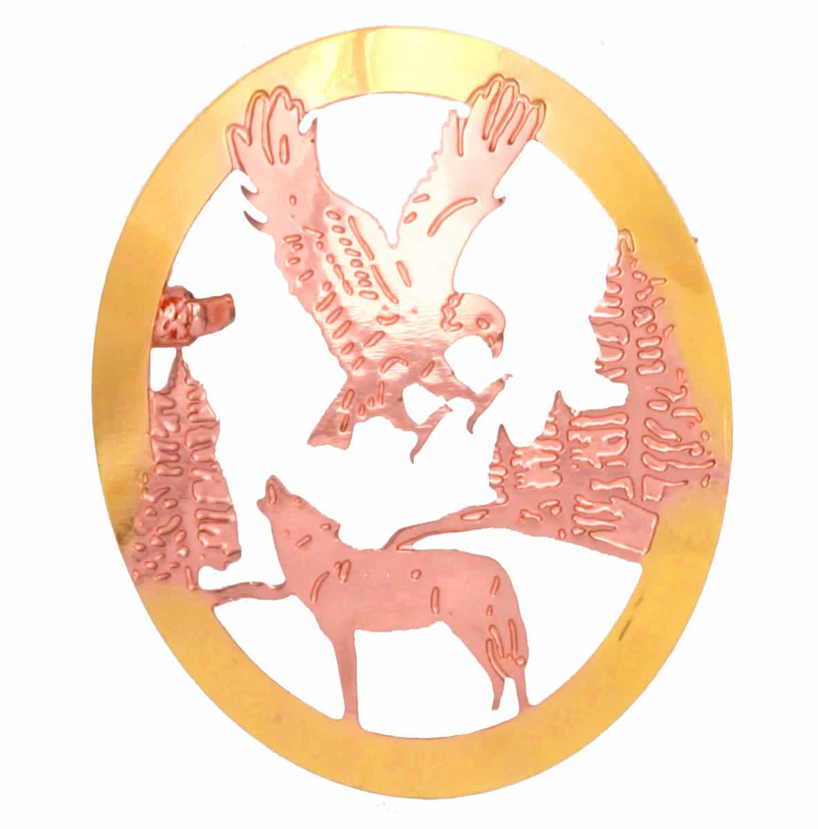 This fascinating wolf and eagle brooch is offered in two tone copper and gold cut through design and protected with an acrylic finish. If you are looking for a wholesale handmade jewelry supplier with high quality, unique selections and friendly customer service then Copper Reflections is the best place in the United States and Canada.