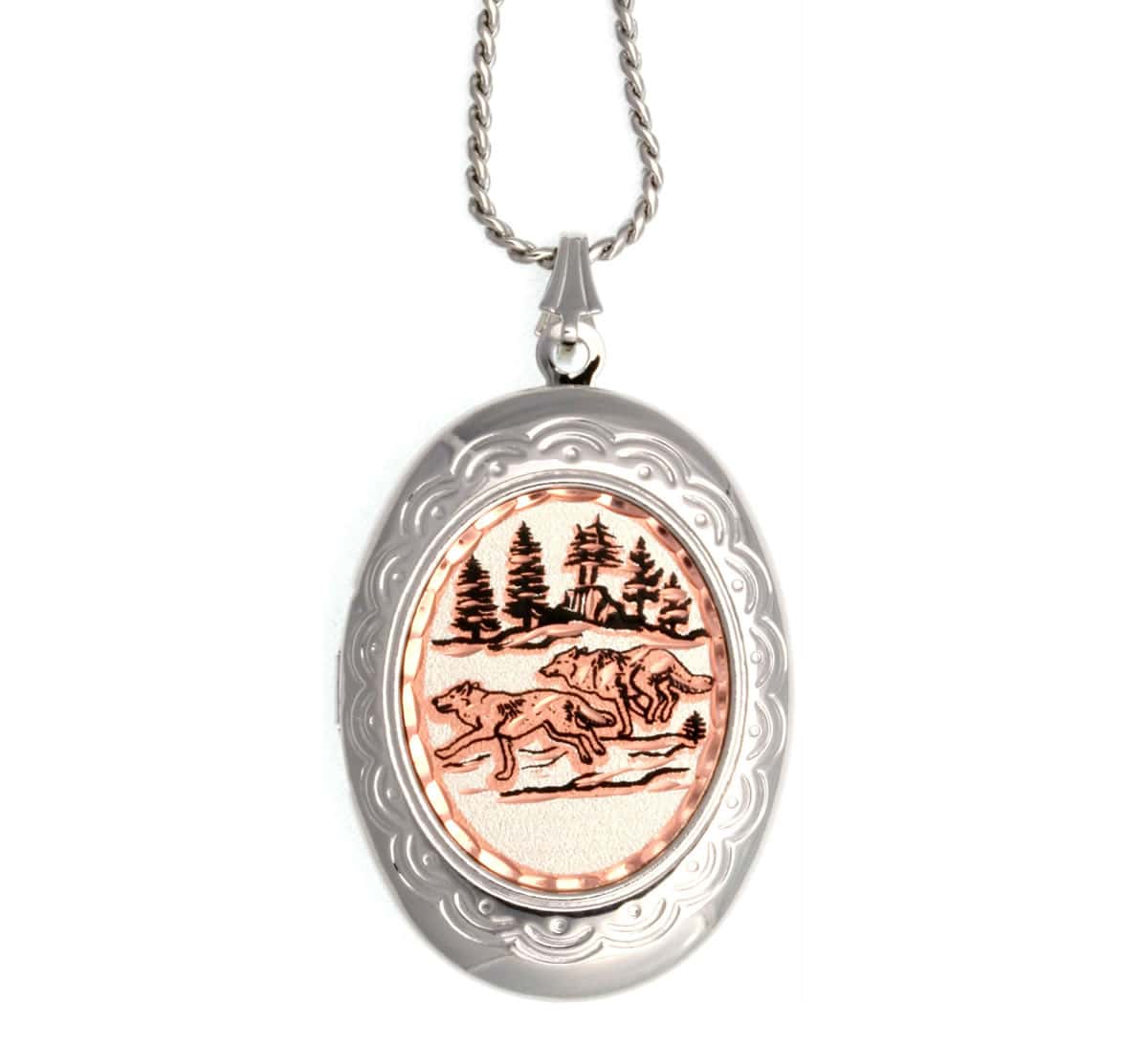 Running wolves represent freedom as well as loyalty. Wolves travel in packs and mate for life while at the same time are fiercely independent. Each handmade locket is handcrafted, silver plated and diamond cut on copper. Wolf jewelry is one of the best selling wildlife jewelry themes in Canada and the United States.