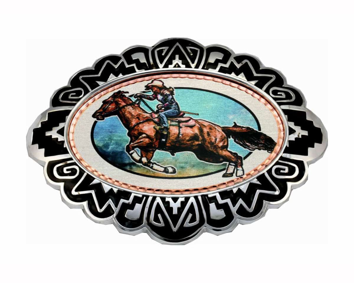 Horse racing western belt buckle made from silver-tone black epoxy accented buckle embellished with colorful copper artwork. Buy cowboy belt buckles that will complement your gorgeous western outfits. The overall size of western belt buckles is 3 inches x 4 inches (7.8 cm x 10 cm ) and the belt holder will hold up to 1 3/4 inch (4.5 cm) wide belt. This exceptional western belt buckle will make perfect unique gifts for cowgirls for birthdays, anniversaries, and Christmas gifts. Copper Reflections have a reputation for friendly customer service, wide selections, and the latest western trends in western wear belt buckles.